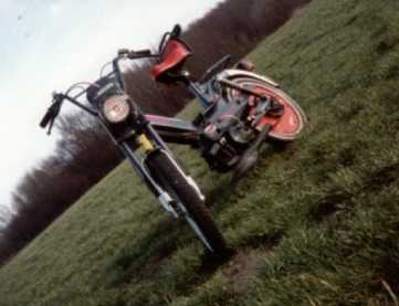 En weer een Puch Rider Macho. I heb er een andere uitlaat onder gezet en een wielplaat in het achterwiel. Het rode zadel doet nog denken aan mijn eerste Zundapp. Later heb ik hem weer veranderd en er rode wielspaken in gezet. Dit was in 1991.