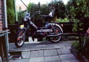 Again, a Puch Rider Macho. I have changed the exhaust pipe and put in a wheelplate in the rear wheel. Also a red saddle as a tribute to my first Zundapp. Lateron i changed the bike completely and put in red wheel spokes. This was in 1991.
